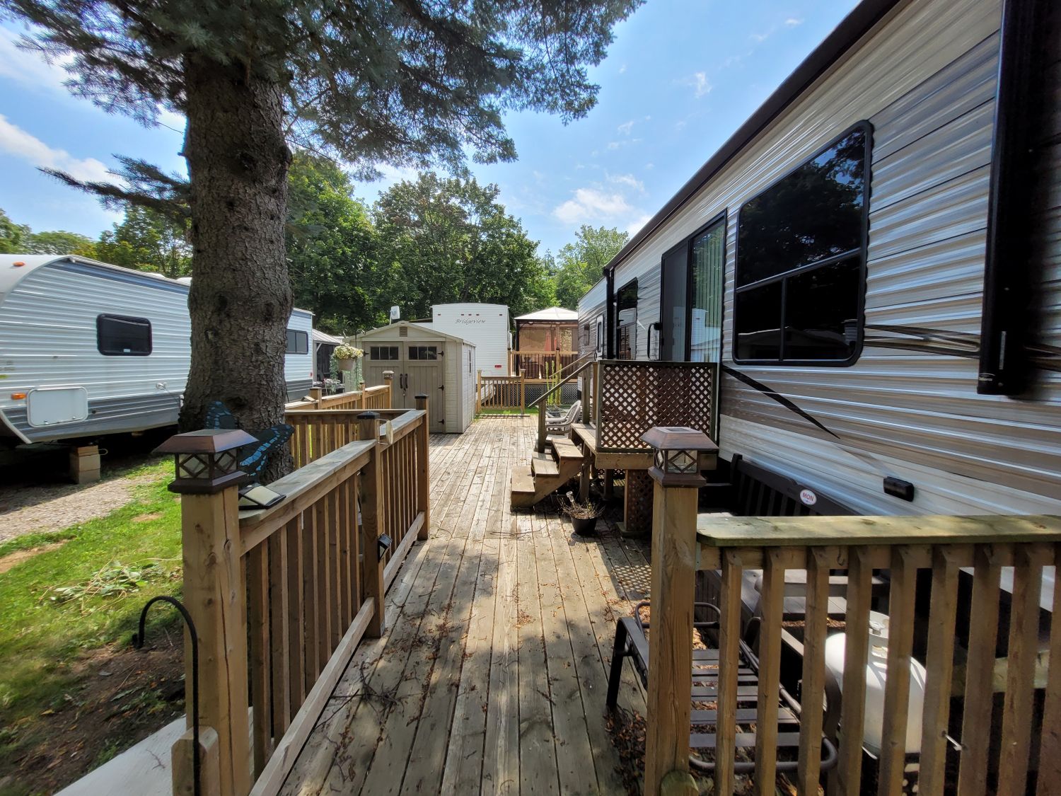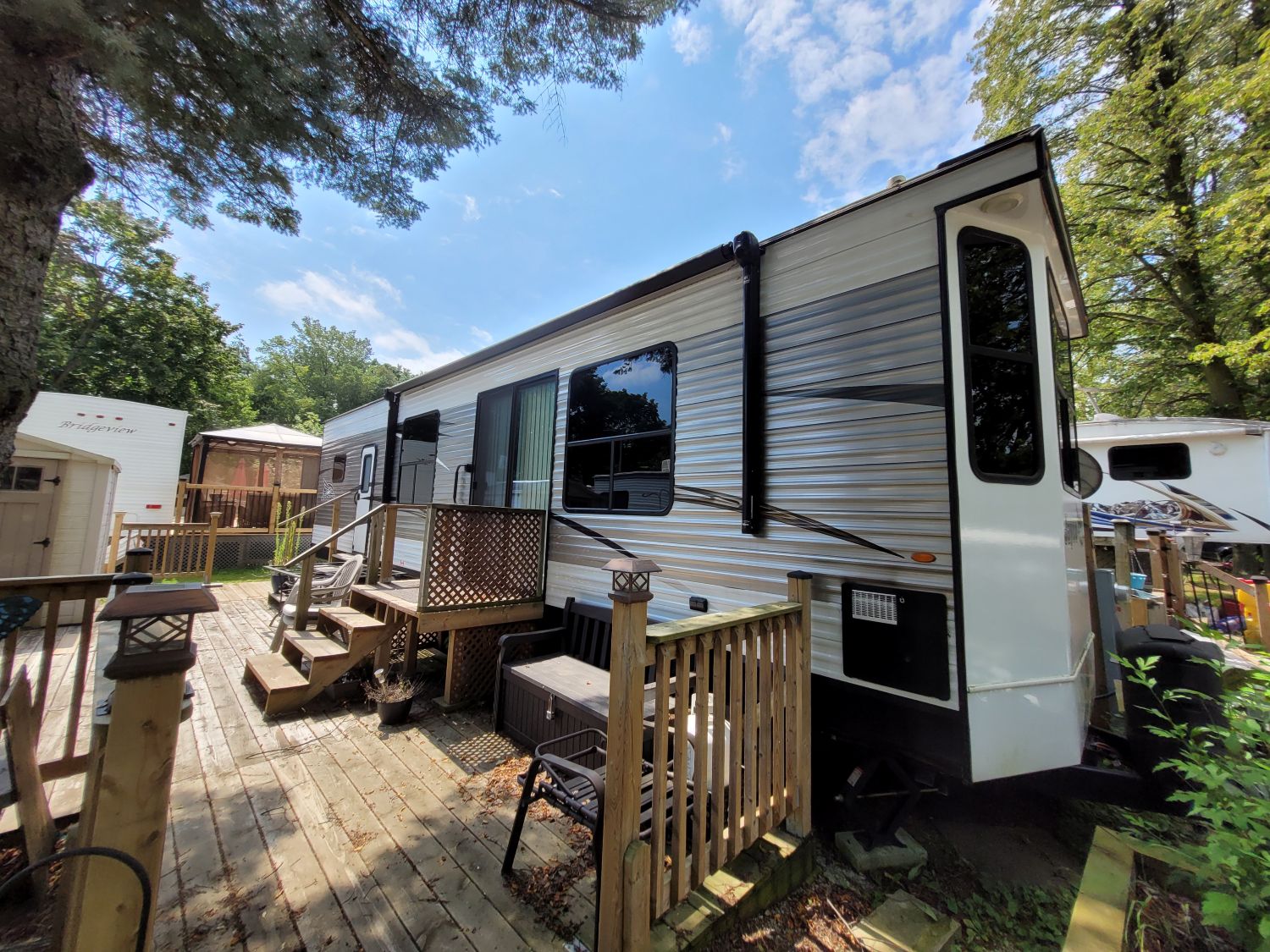The Ultimate Destination Setup. Skip the construction phase and move right into this professionally upgraded 2018 Jayco 40BHTS. Perfect for families or extended stays, this destination trailer is enhanced by high-quality external structures that double your living and storage space. Professionally Built Large Wooden Deck: A massive, custom-engineered wooden deck provides the perfect outdoor lounge and dining area. Built to last with reinforced joists and clean finishes. Included is storage shed. Secure, dry, and perfect for bikes, patio furniture, or seasonal gear. Spacious 3-Slide Layout: The 40BHTS model features a front kitchen with residential appliances, a middle "bonus" bunkroom (ideal for kids or an office), and a private rear master bedroom. Wide-Body Comfort: At 102" wide with high ceilings, this unit feels like a home, not a trailer. Climate Ready: Equipped with a 15,000 BTU A/C and 40,000 BTU furnace to keep you comfortable from spring through late fall. -