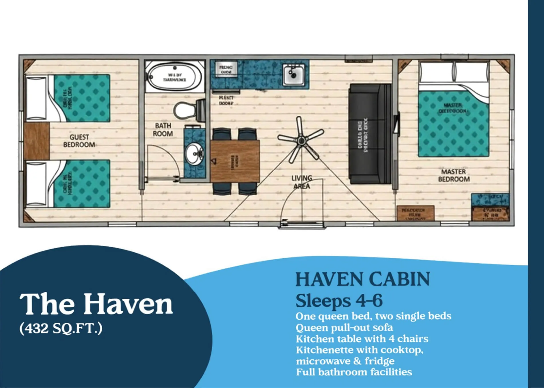 Get room for the whole crew! With two bedrooms, a full bath, and 385 sq.ft of space, this cabin offers the extra room needed for friends, family, or your favourite adventure gear. Blending durability with comfort, it’s the perfect choice for multi-day stays or long-term summer residencies.